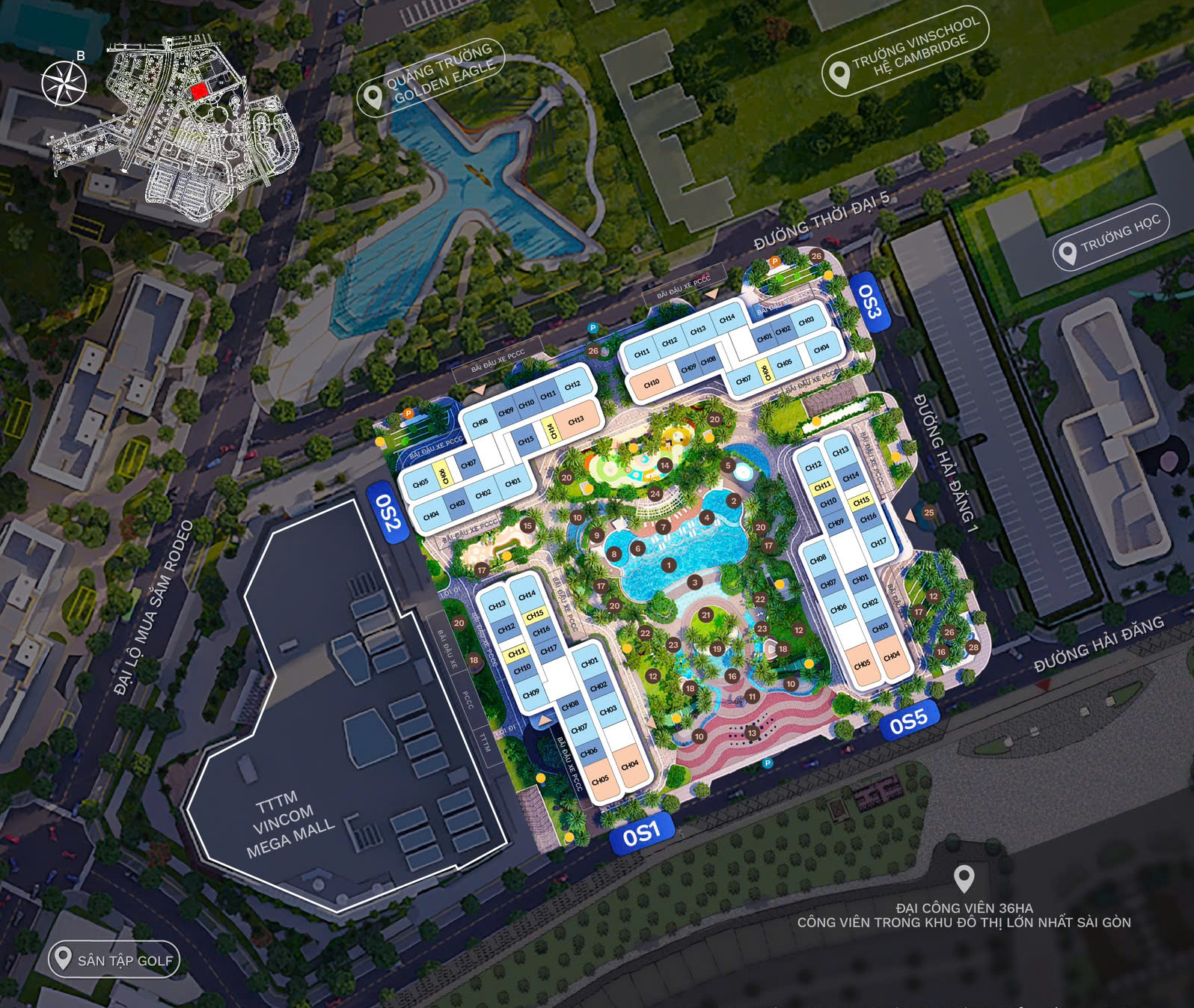 Hành lang tầng điển hình rộng: 1,8m x cao 2,6m. Khu Kid Zone khu vui chơi trẻ em: Diện tích từ 53 – 73 m2; Toà OS2, OS3 đặt ở Tầng 14; Toà OS1, OS5 đặt ở Tầng 2